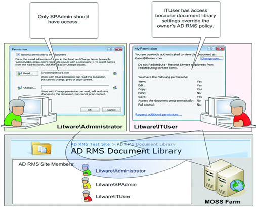با استفاده از یک معماری client-server ، زمانی که سرور برای احراز هویت استفاده می شود ، نرم افزار RMS-Based Client برای محافظت از اطلاعات و تعریف حقوق دسترسی استفاده می شود .محتوای محافظت شده توسط RMS رمزنگاری شده و یک سیاست استفاده در درون داده ها تعبیه شده که مجوزهای دسترسی را تشریح می کند .