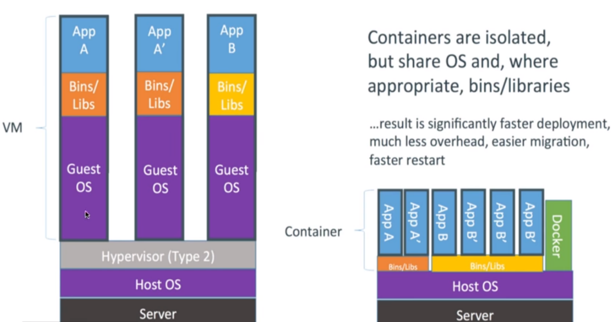 ولی قسمت راست تصویر ابتدا سیستم عامل را بر روی سرور نصب کرده و سپس Docker را راه اندازی کنید با این کار یک لایه نسبت به زمانی که ماشین مجازی راه اندازی می کنید حذف میشود با اینکار سرعت اجرای Application ها بالا می رود . وقتی Applicationی را راه اندازی می کنیم هیچ دخالتی با Application دیگر را ندارد .